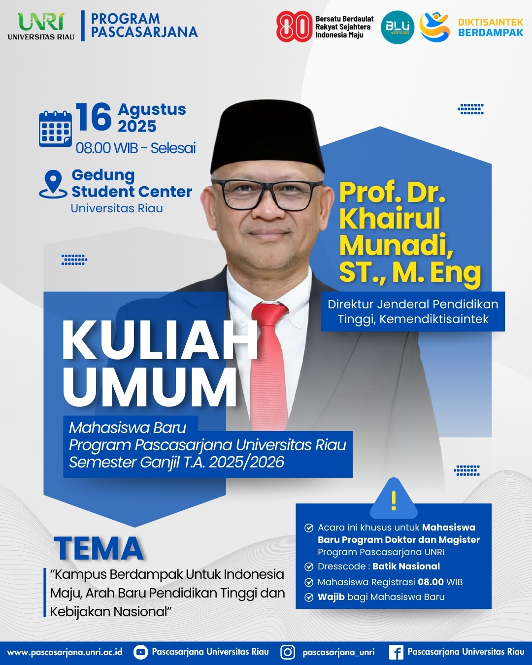 Diberitahukan kepada seluruh Mahasiswa Baru Program Pascasarjana Universitas Riau Semester Ganjil Tahun Akademik 2025/2026 bahwa akan dilaksanakan Kuliah Umum yang wajib dihadiri oleh seluruh mahasiswa baru.